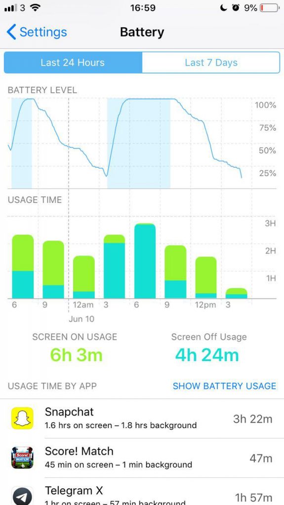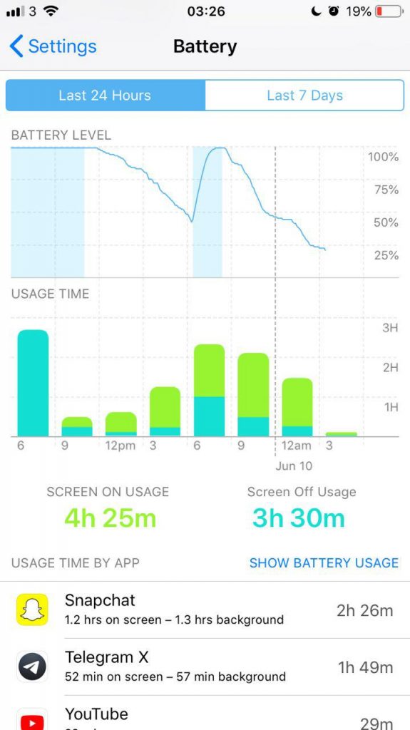 On a normal school day, I am on 4G for about 6 hours and I get home around 4pm. I got about 4 hours of Screen-On Usage and 4 hours Screen-Off Usage. I usually charge my phone up when I get home and plug it in when I go to sleep at night. After waking up, I was back at 100%, and at around 3:30am I fell asleep. I had gotten around 4 hrs and 25 mins of On-Screen usage from my iPhone. On a weekend day however when I was on Wifi the whole day, I got 6 hours On-Screen usage. See for yourself from the screenshots below but for me, battery life has remained the same. This is positive as this is only the first beta of iOS 12.