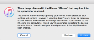 Once you see a popup that says your iPhone has trouble being updated or restored, click on the update button. Sit back and relax for 5-15 minutes as iTunes reinstalls the iOS and cleans up the errors and bugs your iPhone has went through. After the iPhone is done with the restore, setup your iPhone and restore it from the recent possible backup you made on iTunes or iCloud.