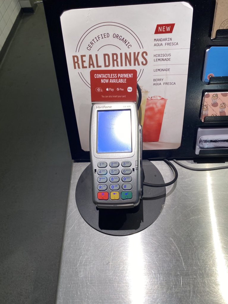 At Chipotle restaurants, one should be able to find a sign on top of the card reader, showing that it accepts Apple Pay, as well as Google Pay, Samsung Pay and other NFC-based payment services.