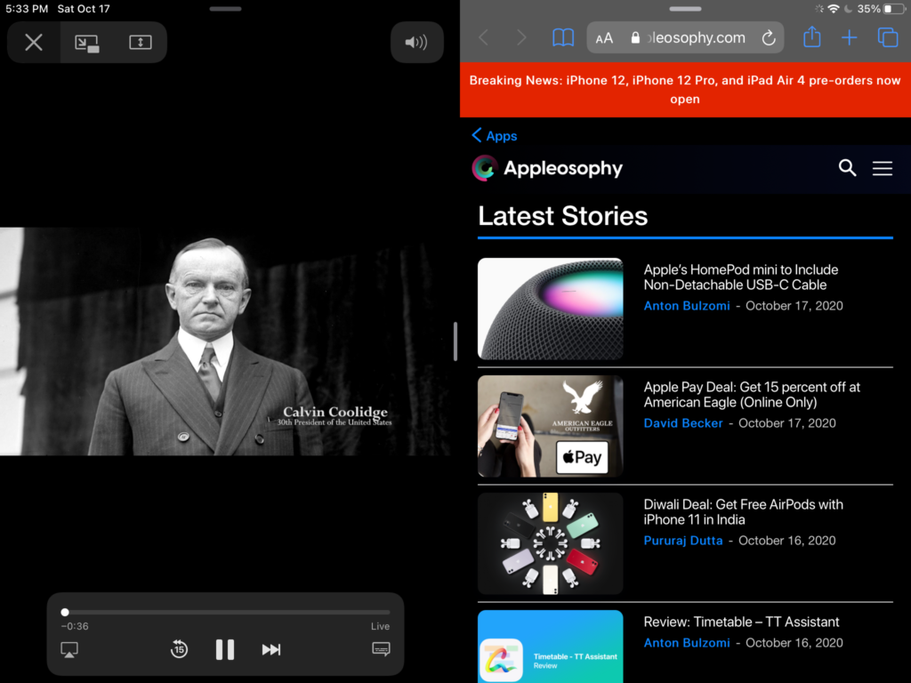 Split View support on KlowdTV’s iPadOS app on an iPad running iPadOS 14