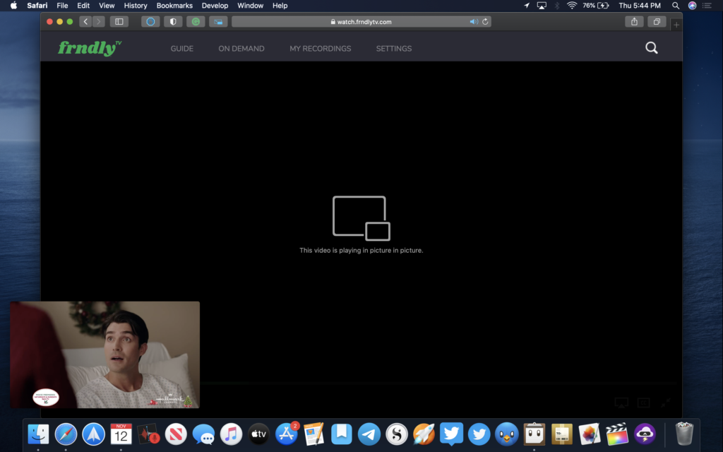 Once installed on your Mac, open Safari, go to Frndly TV, sign into your account and start streaming a channel. When your movie has begun, click on the PiPifier icon on Safari’s toolbar and it should move the content into a window you can move around while working on other tasks.
