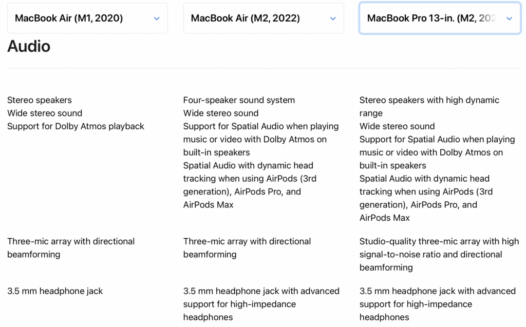 If you look at the products’ spec page, one feature that Apple brings to two of its newest laptops is support for high-impedance headphones on the headphone jack. Originally introduced on the higher-end 14-inch & 16-inch MacBook Pros, the headphone jack with this support is a huge benefit for power headphone users who need higher audio levels.