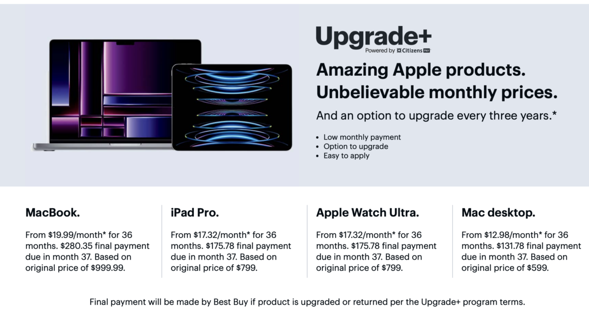 Customers in that plan will purchase a select Apple product from Best Buy with monthly payments spread across the three years. Once the 36-month period is over, they can decide whether to upgrade to a newer model, pay off the remaining balance of that purchase in the 37th month, or return the device and exit the program.