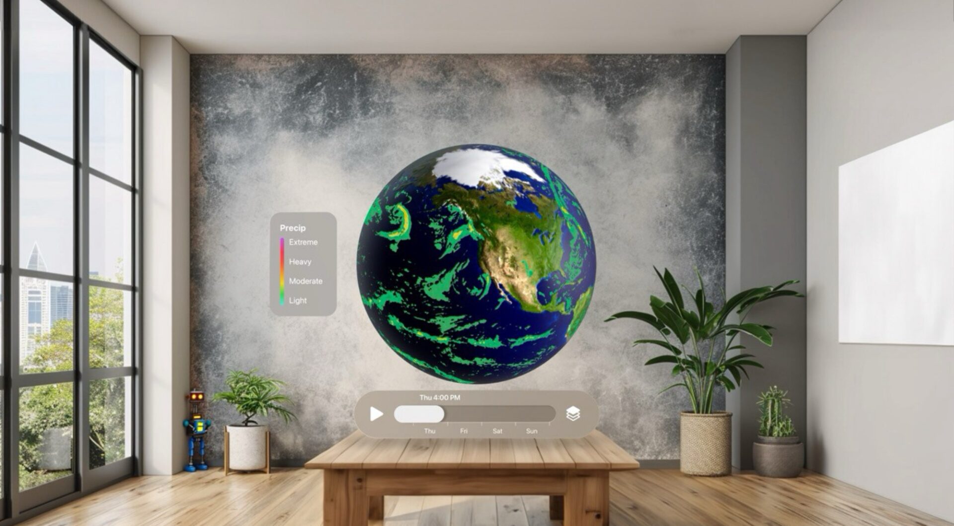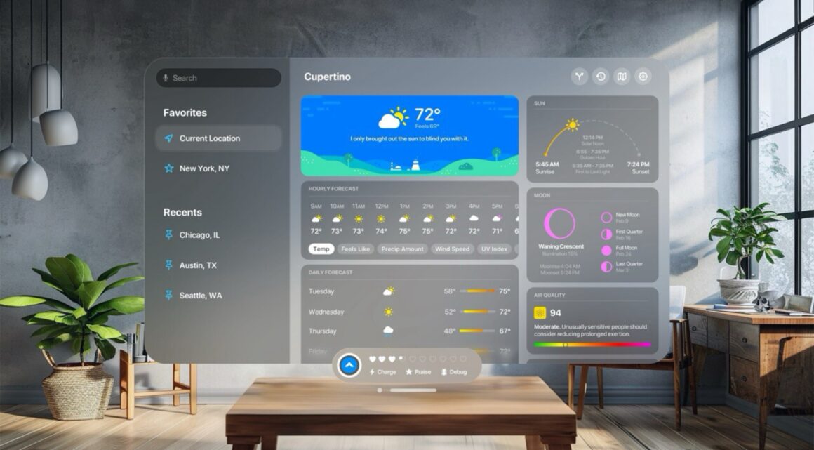 The app has received its own original design for visionOS for the Apple Vision Pro and comes with features such as being able to have a 3D view of the world that shows temperatures, wind speeds, and precipitation info.