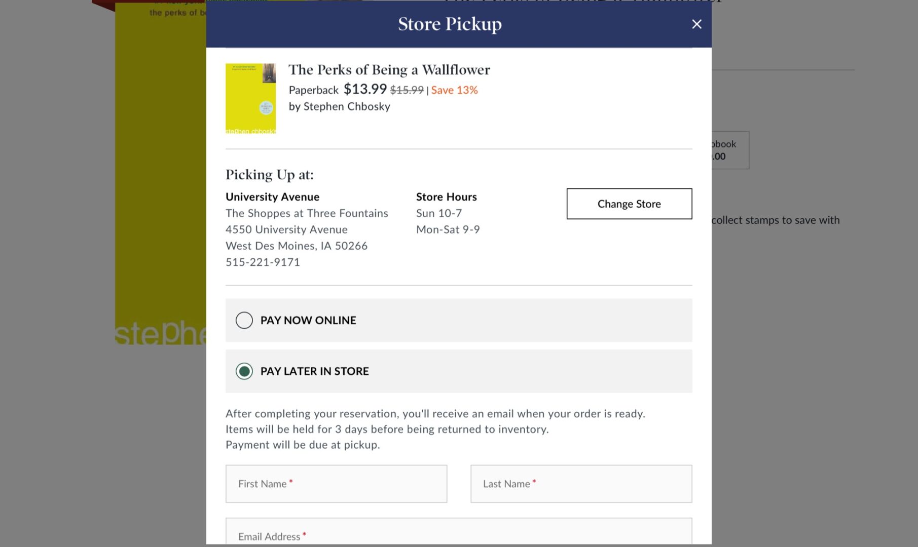 The way to do this will be through the Barnes & Noble website, where you can go to place an order for store pickup and then decide to “Pay Later in Store” when you go to retrieve your order.