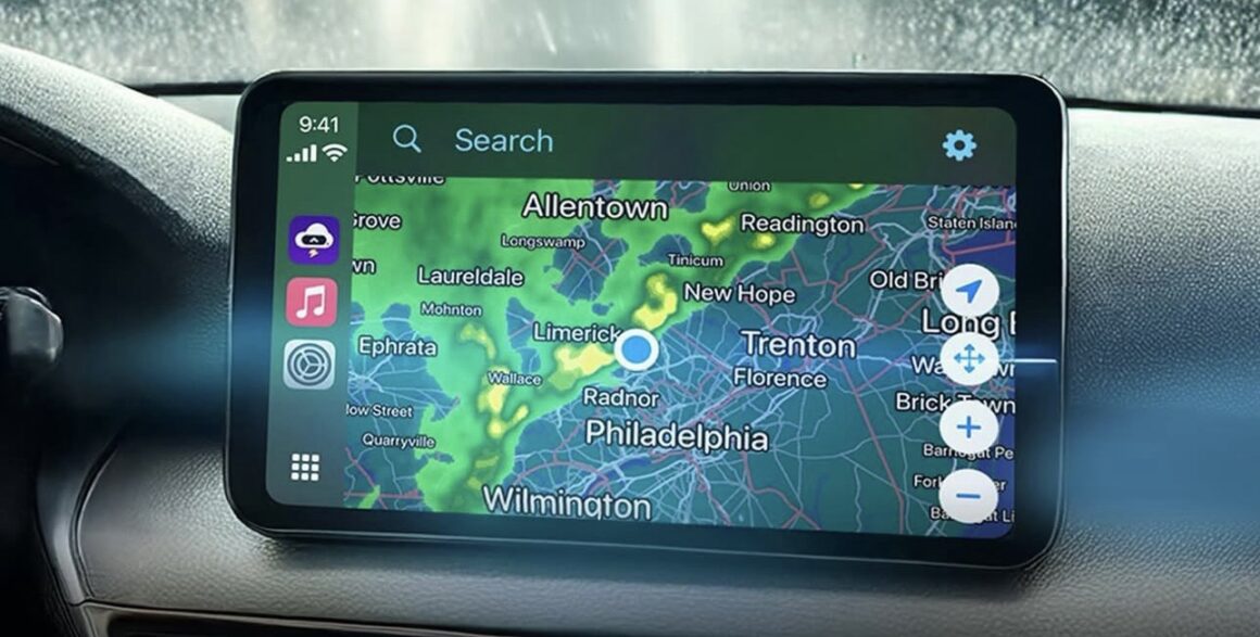 Yes, that means that you can view a live weather radar right from the dashboard of your vehicle without having to pull it up separately on your iPhone or Apple Watch.