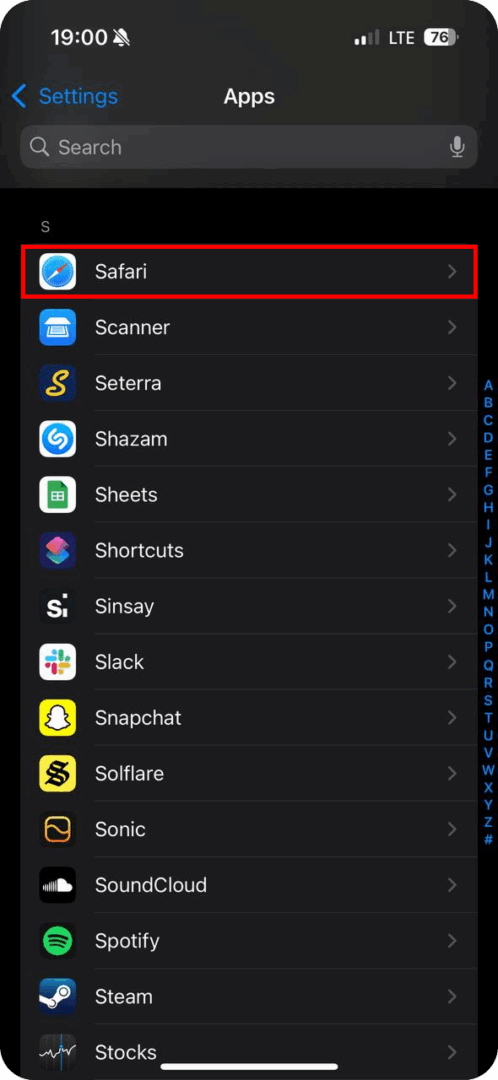 1. Open the Settings app and scroll to Safari. Tap Safari to open its settings panel.