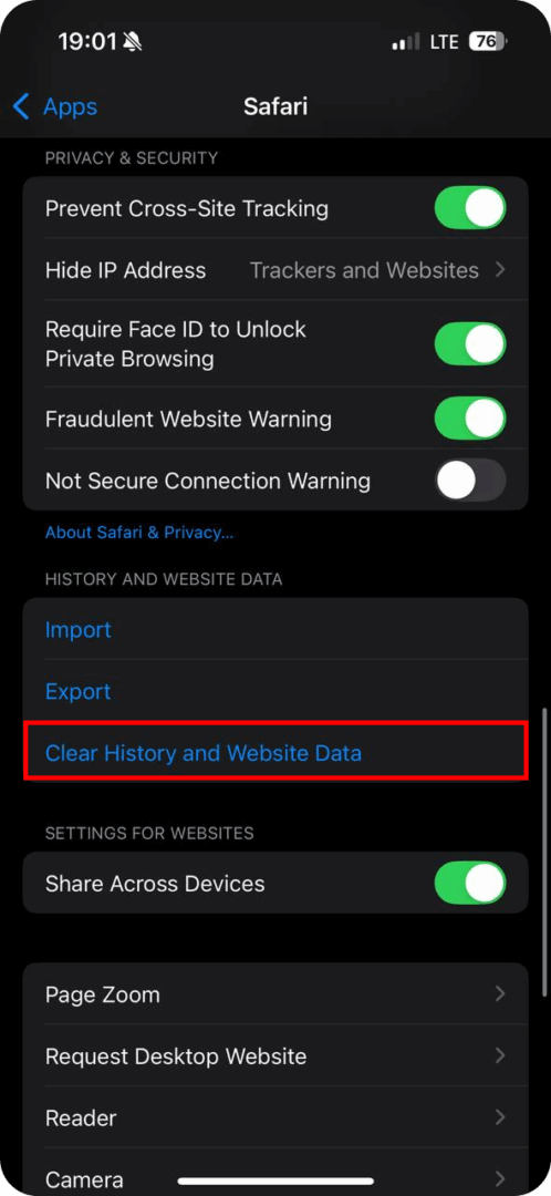 2. Tap Clear History and Website Data. This option appears near the bottom. Tap once.
