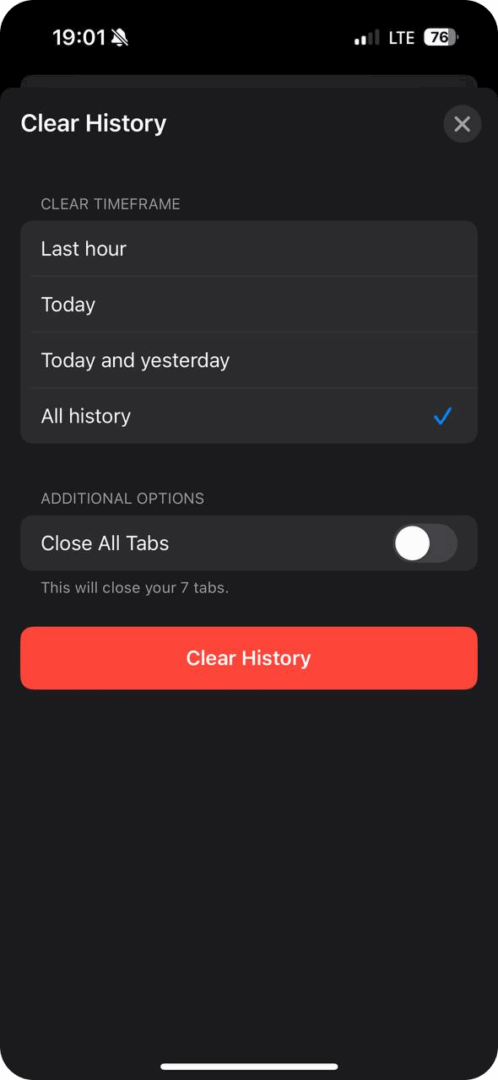 3. Confirm your choice. A pop-up warns that history and website data will be erased. Tap Clear History.