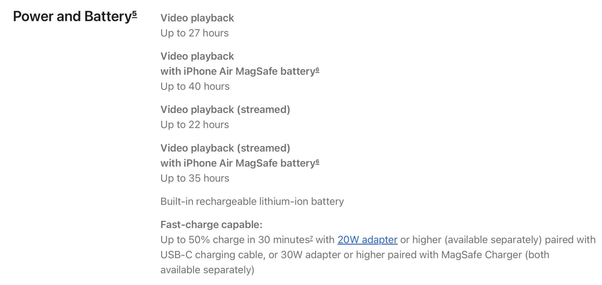 It’s possible that the battery inside the MagSafe Battery pack has the same capacity as that of the iPhone Air itself. Apple claims that the MagSafe Battery provides up to 65% additional charge to iPhone Air; that’s mainly due to the inefficiencies of wireless charging when some energy would be lost when transferring to the iPhone Air. According to the Tech Specs/Compare page, users should get up to 40 hours of video playback with the MagSafe Battery (vs. 27 hours with just the iPhone Air itself).