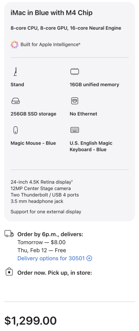 So as you can tell, the base iMac does not include Touch ID or Ethernet by default; configuring that to both of these options would set you back $110 in total, bringing the price from $1,299 to $1,409 (and that’s before any memory/capacity upgrades):