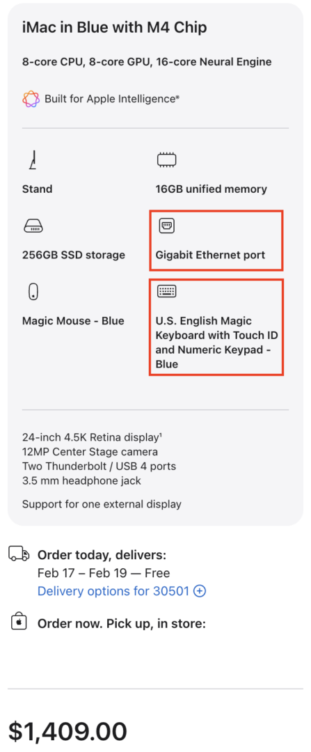 During the iMac’s introduction, Apple touted that the Ethernet port was relocated to the power adapter instead of directly on the iMac to “keep your desktop less cluttered”. However, the base iMac model does not include Ethernet either, so if you prefer to have Ethernet built-in (without using some Ethernet-to-USB-C adapter to take up one of the ports), that upgrade would set you back $30.