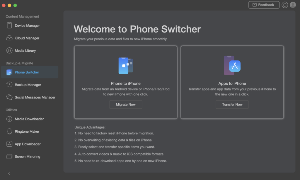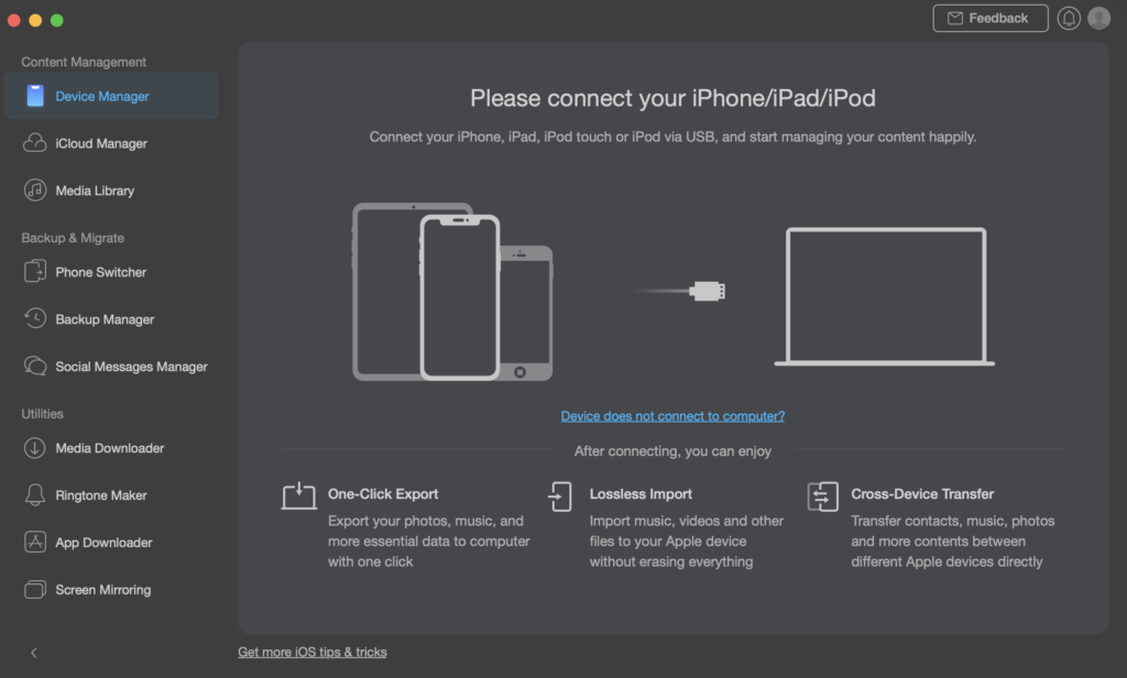 AnyTrans isn’t an ordinary iPhone manager. It features many things you simply wouldn’t use until now! This includes a ringtone maker, app downloader, media downloader, and screen mirroring, all built into AnyTrans, no need for extra software.