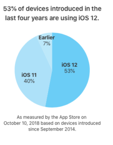 iOS 12, which was first previewed at WWDC on June 4, 2018 is now actively being used on 50% of iOS devices in use since September 2014, that include the iPhone 6, iPhone 6s, iPhone 7, iPhone 8, iPhone X, iPhone XS and iPhone XR devices.